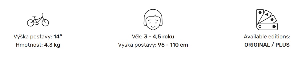 - geometrie pro začátečníky s velikostí kol 14″ a přívětivými jízdními vlastnostmi: extrémně snížená horní rámová trubka, velmi nízká poloha sedu, dlouhý rozvor a geometrie řízení, která toleruje chyby – to vše zajišťuje stabilitu, dobrou rovnováhu a větší požitek z jízdy