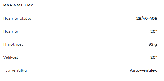 Schwalbe duše 20" AV6 (28/40‑406) s auto-ventilkem je kvalitní cyklistická duše vhodná pro pláště šířky 28 až 40 mm na ráfcích o průměru 20 palců. Díky celo-kovovému auto-ventilku (AV) je ideální pro snadné a rychlé huštění běžnou automobilovou pumpou. Duše váží pouhých 95 gramů, což zajišťuje nízkou hmotnost bez kompromisů v odolnosti a spolehlivosti. Je skvělou volbou pro městská, dětská i skládací kola, kde se klade důraz na funkčnost a jednoduchou údržbu.