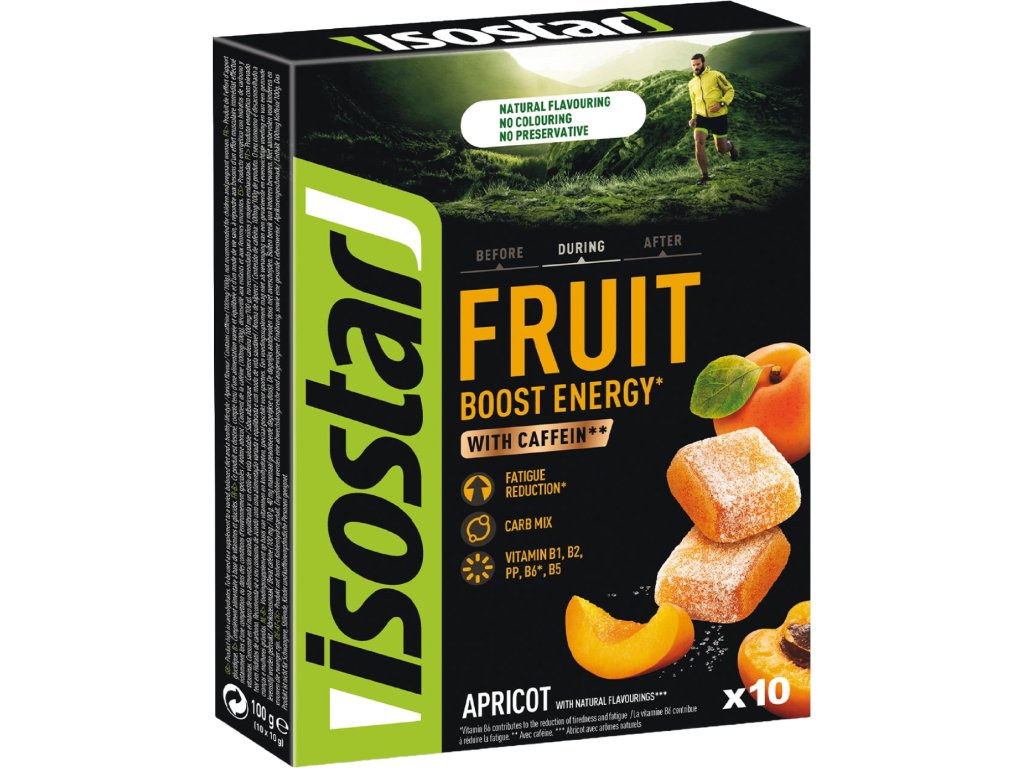Isostar Fruit Boost Energy je ovocné želé s kofeinem, vitaminy a vybranými sacharidy pro okamžitý nástup energie, oddálení pocitu vyčerpání i extra energii nutnou například pro náhlé zrychlení či kopcovité úseky. Obsažený kofein pomáhá zvýšení vytrvalostního výkonu. Jednotlivě balené jahodové bonbóny mají výbornou chuť a rychle se rozpouští v ústech.
