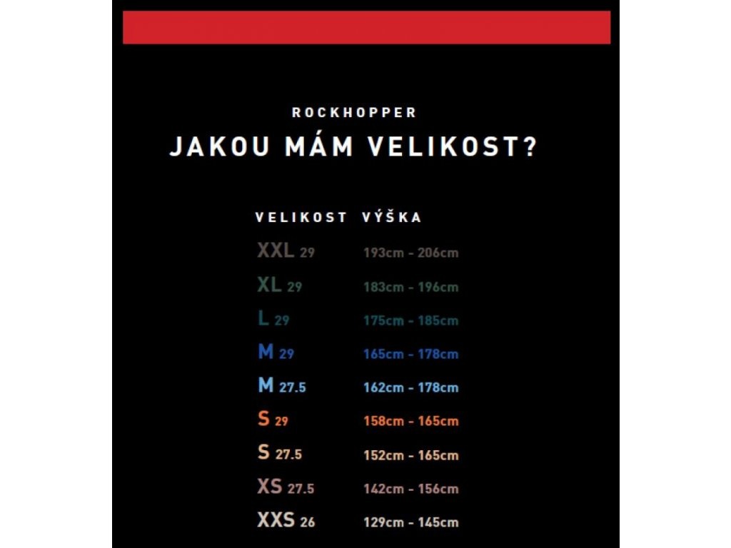 - S cílem zajistit, aby Rockhopper sedl každému a současně poskytl ten nejlepší výkon, jsme spárovali každou velikost rámu Rockhopper s optimální velikostí zapletených kol. Výsledkem je Rockhopper, který sedne každému jezdci a díky optimální velikosti sady kol přinese v každé velikosti optimální ovládání.