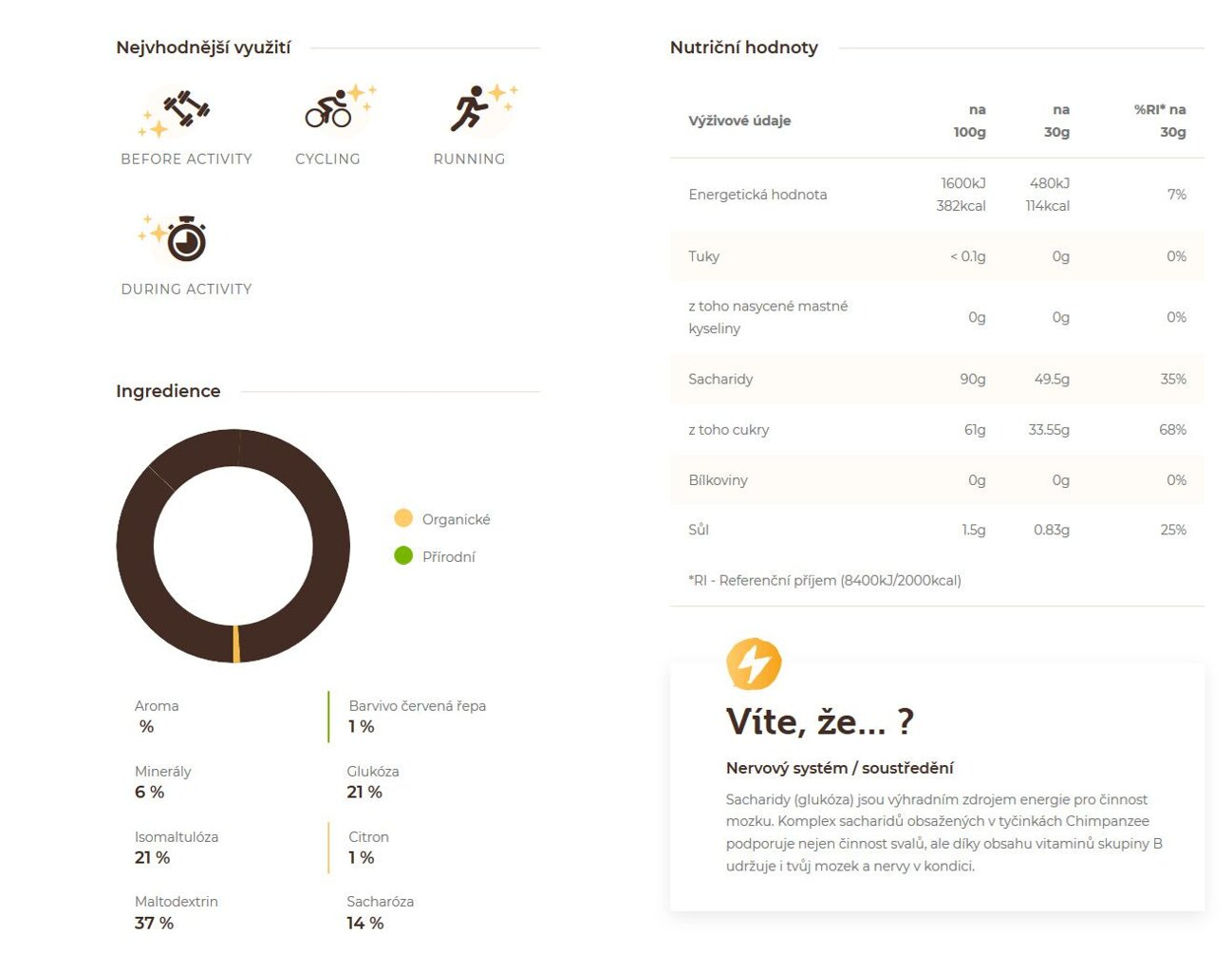 - Obsahuje 20% isomaltulosy (vysokomolekularní sacharid), dobře stravitelný, pozvolně uvolňuje energii