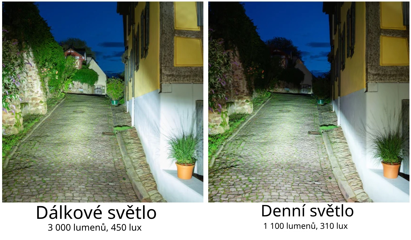 - Potkávací světlo: 1,100 lumenů, 310 luxů, 16 W