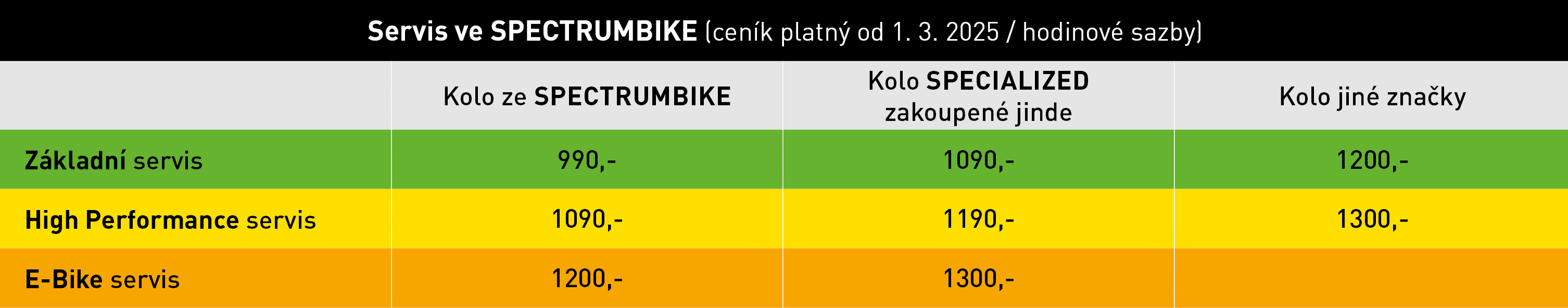 - garanční prohlídka "nultá" - po 100km od koupě kola (max do 6měs.). Kola Specialized zakoupená u nás: zdarma. Kola Specialized zakoupená u jiných prodejců: 1100Kč - 1600Kč. Garanční prohlídka kola od jiné značky (vč případného potvrzení ZL) = 2200Kč.