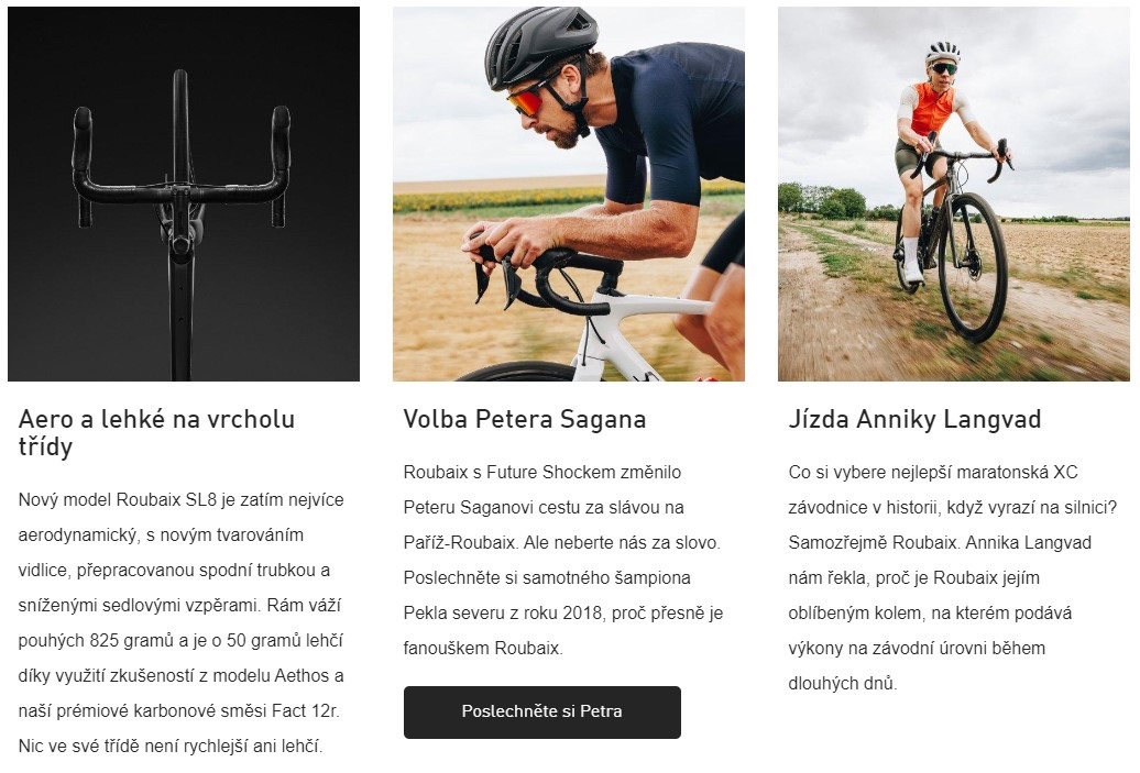 - VÝKON: Nové Roubaix SL8 je naše dosud nejaerodynamičtější díky novým aerodynamickým tvarům z naší knihovny tvarů Free Foil a sníženým sedlovým vzpěrám. S hmotností pouhých 825 gramů je rám o 50 gramů lehčí a využívá zkušeností z Aethosu – nejlehčího sériově vyráběného rámu na světě – a naší prémiové karbonové směsi Fact 12r. Nic ve své třídě není rychlejší nebo lehčí než Roubaix.