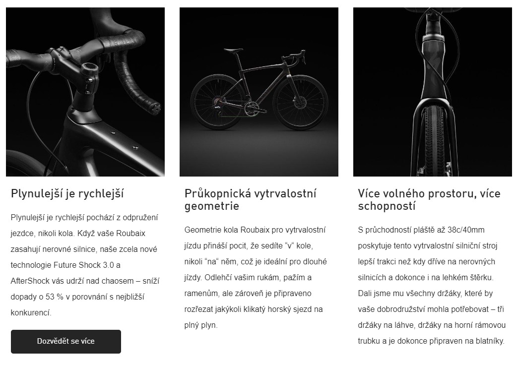 - Roubaix SL8 je nejplynulejší silniční kolo, jaké kdy náš tým Ride Science testoval - snižuje nárazy na řídítka a sedlo o 53 % oproti nejbližší konkurenci. Díky tlumiči Future Shock 3.0 se kolo rychle pohybuje po nerovnostech, přitom hmotnost jezdce zůstává stabilní a udržuje hybnost v nerovném terénu. Typické vidlice se při nárazu vychýlí dozadu, což způsobí měřitelnou ztrátu rychlosti. Je to vědecký fakt, plynulejší je skutečně rychlejší.