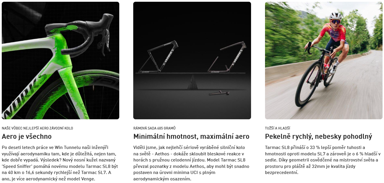 Silniční kolo Tarmac SL8 je jednoduše nejrychlejší – svou promyšlenou aerodynamikou, hmotností a zážitkem z jízdy předčí i tvá nejvyšší očekávání.