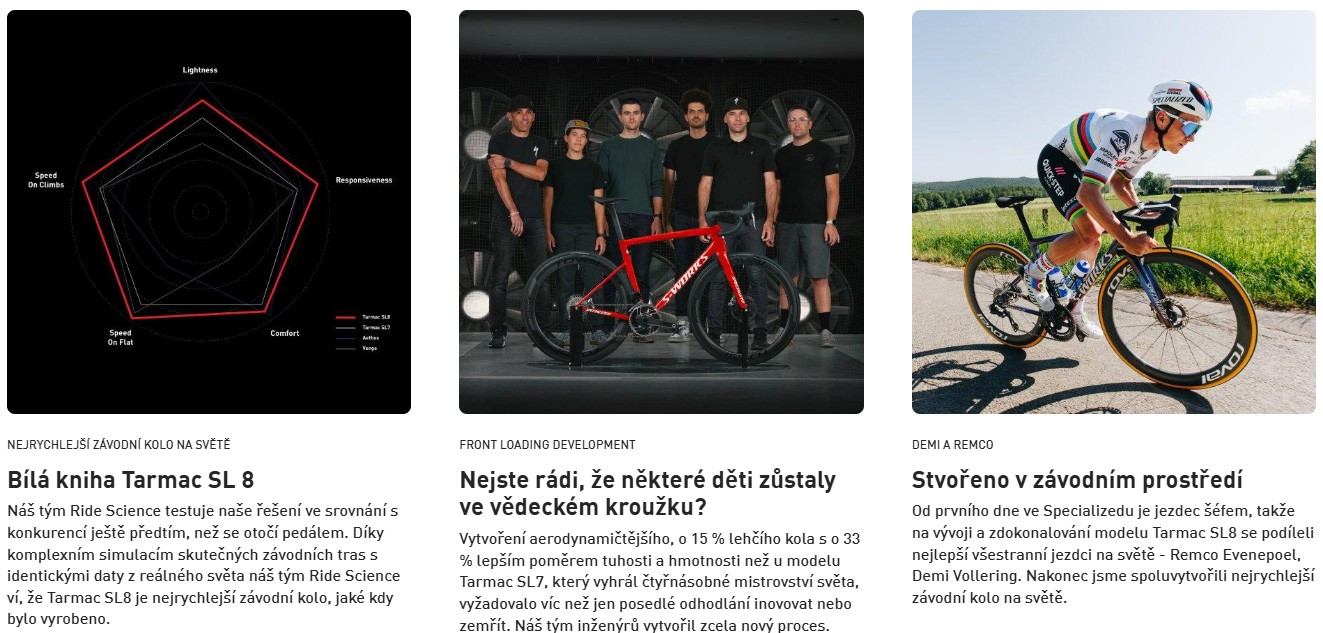 Za posledních dvacet let a osm generací tohoto modelu jsme Tarmac SL8 vychytali do toho nejtitěrnějšího detailu, tak aby z něj nebyl pouze nejrychlejší člen řady Tarmac, ale jednoduše nejrychlejší závodní kolo na světě. Troufneš si na něj?