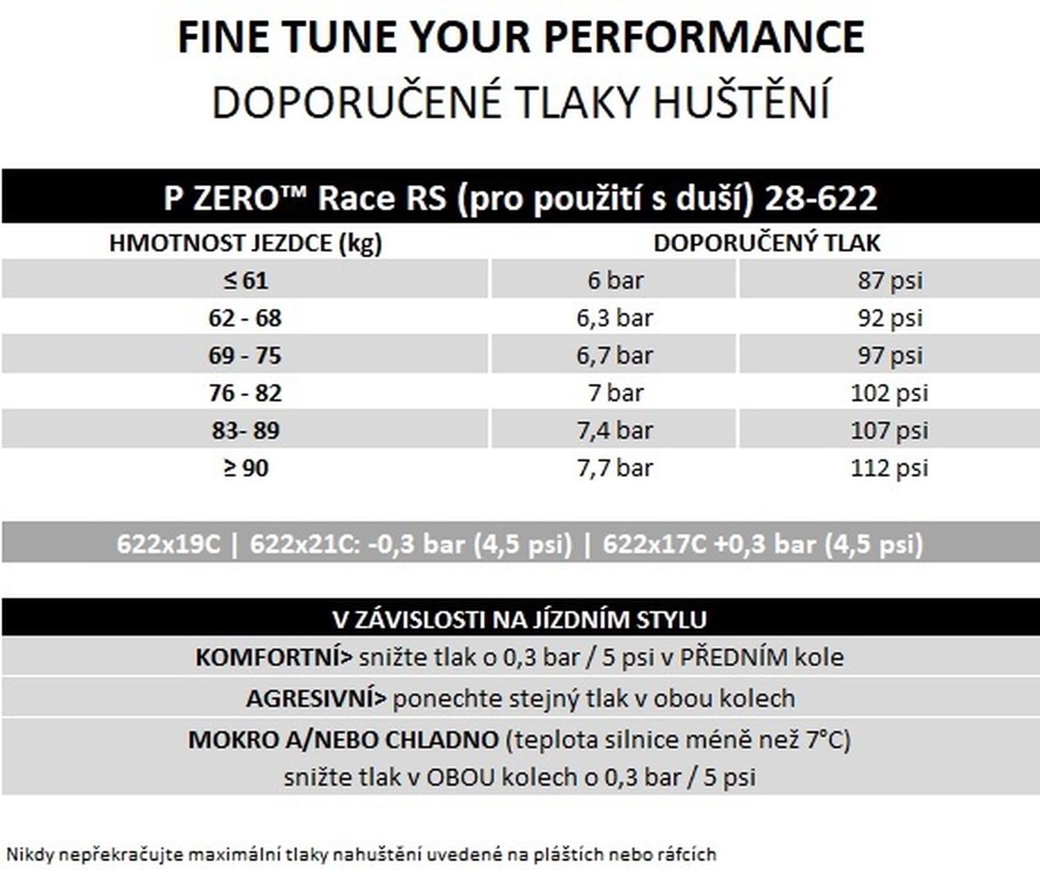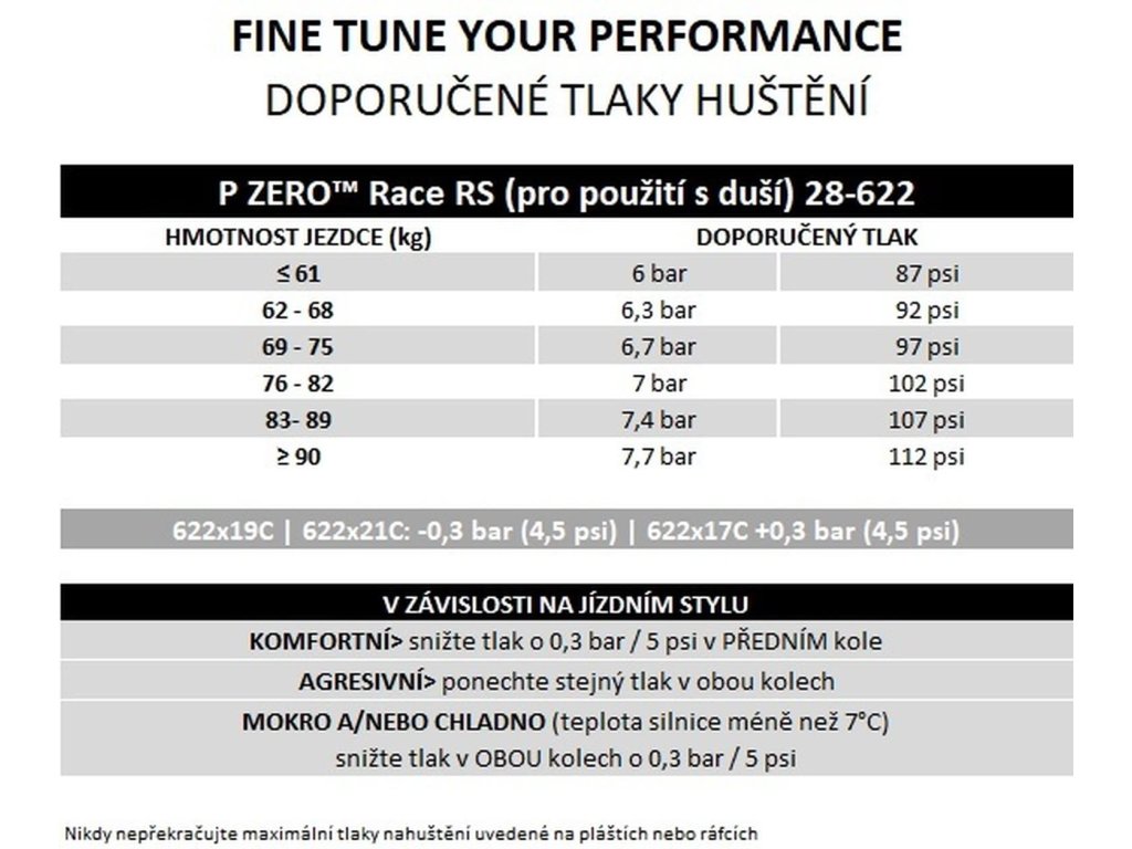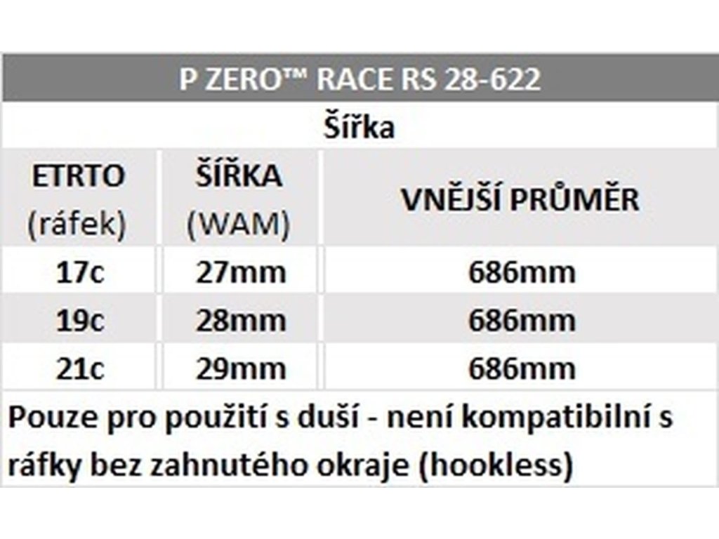Využívá nejnovější technologie vyvinuté ve spolupráci s profesionálními závodníky z našich týmů World Tour, díky čemuž je rychlejší, lehčí a přilnavější než univerzálnější P ZERO™ Race. Tento výkonnostní skok umožňuje inovativní gumová směs SmartEVO2 – nejpokročilejší směs Pirelli, která přináší výjimečnou přilnavost a výkon. Verze P ZERO™ Race RS pro použití s duší dosahuje nejlepších výsledků v kombinaci s naší ultralehkou TPU duší SmarTUBE, která zajišťuje špičkový výkon a rekordně nízkou hmotnost celého systému.
